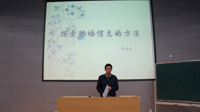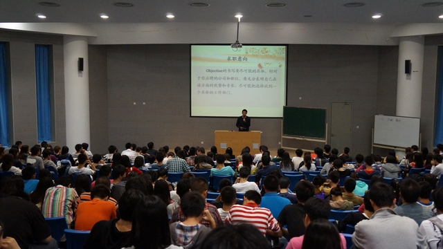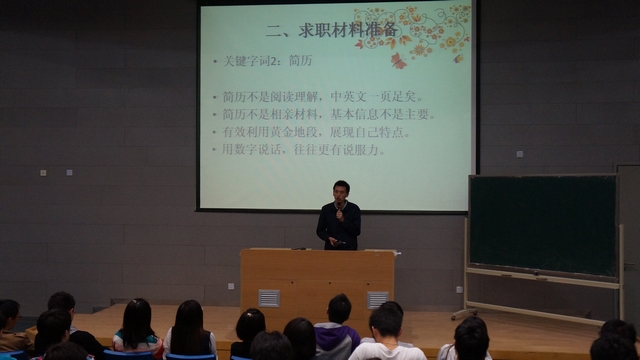首先,郝老师向同学们讲述了本次讲座的目的,是为了使同学们大四面对求职时有更充分的准备。接着,郝老师介绍了一些获取求职信息的途径,比如通过学校的就业指导中心,参加学校里的企业宣讲会;登录一些求职网站,比如中华英才网、智联招聘等;通过已经毕业的校友获取信息等等。然后,郝老师又向同学们讲解了制作简历的重要性以及一些细节问题,并且讲解了网投简历的技巧。最后,郝老师鼓励同学们,要抓住每一次机会,认真对待。