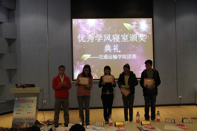 2013年4月10日下午1点,交运伟德betvictor 在交运报告厅组织开展了学风寝室颁奖典礼,伟德betvictor 辅导员朱红红老师、徐晓毅老师、万京老师、李迎旭老师、朱岚老师和陈思琪老师出席本次颁奖典礼,各获奖寝室代表上台领奖。