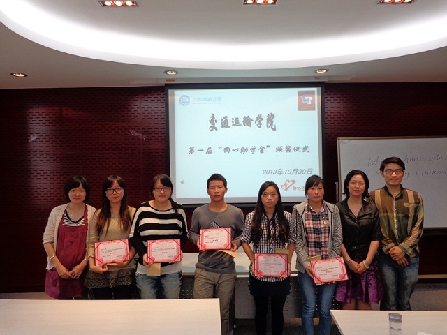 2013年10月30日,伟德betvictor 在交运楼211室举办第一届“同心助学金”颁奖仪式,伟德betvictor 党委副书记赵睿老师、资助专项辅导员陈莉老师,都志亮老师,5位获奖学生及伟德betvictor 同心互助社全体成员出席了此次颁奖仪式。