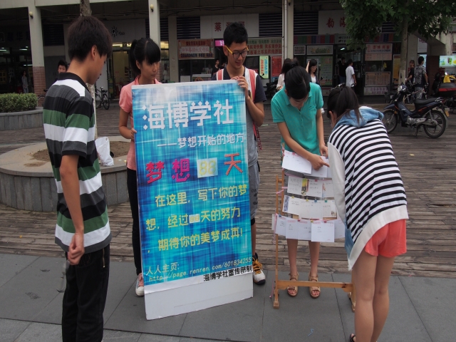 2014年6月18日,伟德betvictor 海博学社在北广举行了一次对梦想八十八天活动的总结—返还明信片活动。本次活动通过海博学社成员摆摊宣讲的形式完成。