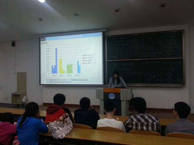在讲座中,朱老师首先向同学们展示了前两年国航12的整体挂科情况,针对挂科科目和挂科人数进行了详细分析,使大家了解国航12在过去两年的总体情况,同时也肯定了在大家共同努力下取得的成绩。随后,朱老师对于挂科情况进行了不同方向的比较,与国航其他年级进行纵向比较,同时也与同年级的其他的专业进行了横向比较,使得大家更明确了自己的目标。最后,朱老师对同学们的挂科原因进行了分析,希望大家能够克服现有的困难,明确目标,争取取得更好的成绩。