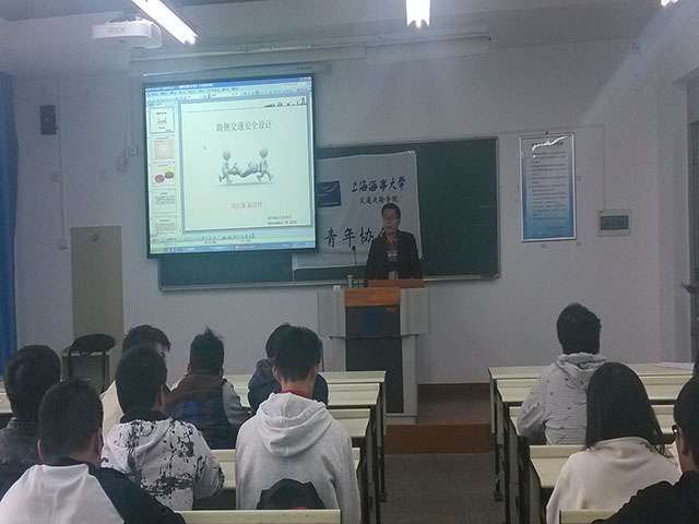 钱老师简单自我介绍之后就对我国道路交通安全形势作出了分析,并且与美国道路交通事故成因做了对比。之后又详细讲解了路侧交通事故的定义及其危害,并且对我国目前路侧安全设计存在的问题进行了分析并且提出了一些解决办法,例如:合理设置视线诱导设施、设置道路越界提醒等。