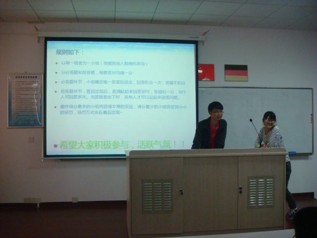 首先,班长和团支书介绍了整个活动的流程。此次的竞答比赛,班级全体同学根据寝室划分为9只队伍,经过必答题环节和抢答题环节的比赛后,分数排在最后的队伍要接受大家提出的惩罚。接下来的正式比赛中,必答题环节,各组实力旗鼓相当,分数相差很小,总体来看女生队伍稍稍领先。而在抢答题环节,各组你争我抢,气氛紧张激烈,各男生队伍凭借更快的反应速度赢得了更多的抢答机会,虽然最终还是没有超越女生队伍,但是却也展现了自我的风采,赢得了阵阵掌声。最终,分数排在最后的男生队伍接受了大家的“惨无人道”的惩罚,活动在欢声笑语中走向了尾声。